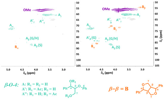 NMR analyses were performed with a Bruker AVANCE III 400MHz spectrometer equipped with a BBFO probe (Z gradient) (Bruker Corporation, Billerica, MA, USA). HSQC NMR analyses, the acquisitions were realized at 50 °C (hsqcedetgpsp.3; 48 scans). Lignin samples (c.a. 50 mg) were dissolved in 600 mg of DMSO-d6. The characterization and quantification of hydroxyl groups in lignin were made using previously developed methods [62,63]. For this analysis, 2-chloro-4,4,5,5-tetramethyl-1,3,2-dioxaphospholane (TMDP) is used as a phosphytilation agent to quantify the different OH groups (phenol, aliphatic, carboxylic). Samples were accurately weighted (c.a. 30 mg) and solubilized in 0.5 mL of a solution of cyclohexanol (3.95 mg/gsolution–internal standard) in pyridine and DMF (v/v: 1/1). Once dissolved, 200 mg of CDCl3 were added before introducing 100 mg of TMDP. The product of the reaction of TMDP with water (δ = 132.2 ppm) was used to calibrate the chemical shifts.