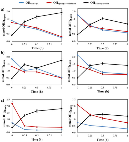 To gather additional insights into lignin oxidation by Pt/TiO2, “precipitate” fractions were analyzed by 31P NMR analyses to follow the evolution of accessible hydroxyl groups over time (Figure 6). In our previous report, a direct correlation between the concentration of guaiacyl and syringyl OH and the amount of “precipitate” recovered over time was demonstrated [13]. The results, obtained under catalysis, tend to confirm this relationship since higher concentrations of guaiacyl and syringyl OH (ca. +0.4 mmol OH/gLignin) after 1 h could be linked to higher “precipitate” yields for each lignin. Therefore, the accessible phenolic groups appear to be at the origin of the depolymerization even with the catalyst; this suggests, once again, that Pt/TiO2 reacts with primary products of lignin oxidative depolymerization.