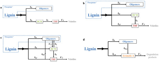 where , , represent the production of oligomer, small aromatic (“DCM”) and aliphatic (“THF”) compounds from lignin, respectively; () is related to lignin’s degradation; portrays the formation of condensed compounds from small aromatics (“DCM”); outlines the degradation of oligomer into aromatics (“DCM”); illustrate the degradation of aromatics (“DCM”) into aliphatics (“THF”); and is the degradation of aliphatics (“THF”) into volatile compounds.