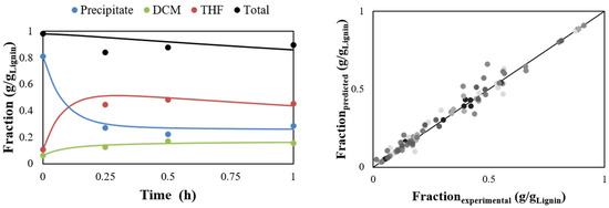 Evolution of the three fractions versus time for EOL-As lignin oxidation (left; see Figures S11 and S12 for the modeling of catalytic and non-catalytic oxidation of the other lignins) and parity plot comparing the model to experimental data for all lignins with and without catalyst (right). Data: (—) model, (●) experimental.