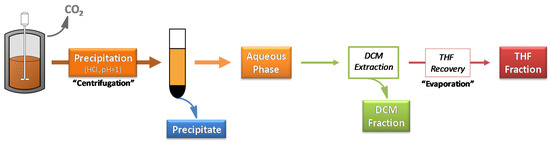 Thereafter, the recovered reaction mixture was filtered to remove the catalyst before the fractionation process (Figure 11). The filtrate was acidified by a 10% solution of HCl to reach a pH of 1 and precipitate appeared. The solid was separated by centrifugation for 10 min at 4000 rpm and washed twice with a 10% solution of HCl, thus leading to the recovery of the so-called “precipitate” fraction after drying. Then, DCM (100 mL × 3) was used to extract the aromatics from the supernatant (“DCM” fraction). The remaining aqueous phase was dried in vacuo. Finally, THF was poured onto the resulting residue, leading to the solubilization of lignin adducts (“THF” fraction) and the removal of salts by subsequent centrifugation. The analysis of each fraction showed three structurally distinct structures, i.e., a highly modified biopolymer (“Precipitate”), a low molecular weight aliphatic fraction (“THF” fraction) and a high added-value aromatic fraction (“DCM” fraction).