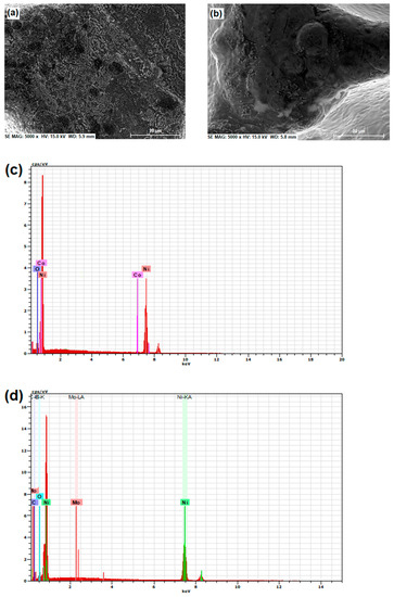 Figure 1a,b below illustrate SEM micrograph pictures of the electrodeposition effect of Co and Mo at small and trace amounts, respectively, on the Ni foam surface, recorded at the same magnification level. For the Co-modified Ni foam (at ca. 1 wt.% Co), the surface of the base material is densely covered with a granular structure of small Co nuclei (see Figure 1a). On the other hand, a sample of Mo-modified Ni foam (at ca. 0.2 wt.% Mo) is comparatively shown in a SEM micrograph picture of Figure 1b. The electrodeposited sample is covered with quite an irregular, amorphous and discontinuous structure through the Ni foam surface. In addition, the more detailed information on the composition of the prepared samples is shown in Table 1. Moreover, Figure 1c,d demonstrate the EDX pattern of Co- and Mo-modified Ni foam electrodes, respectively.