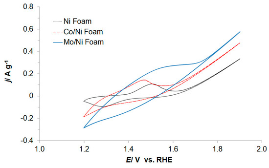 Furthermore, deposition of catalytic nanostructures (see Figure 1a,b) resulted in a considerable enhancement of the electrochemically accessible surface area. The latter could be easily observed in the cyclic voltammetry plot presented for the baseline and the Co and Mo-modified Ni foam materials in Figure 2. Consequently, significant surface modification for the Co- and Mo-modified Ni foams is demonstrated by considerably increased current-density within the corresponding CV profiles.