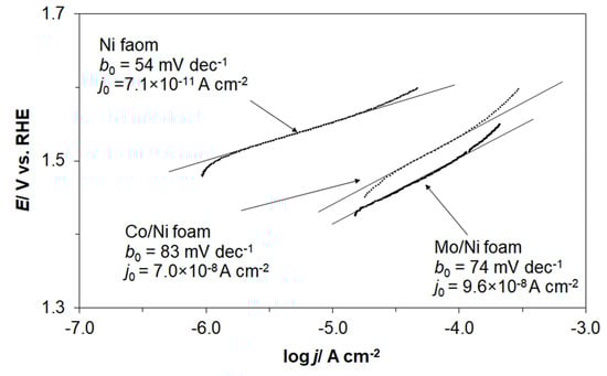Tafel polarization plots recorded at room temperature for electrochemically oxidized, pure Ni foam, Mo- and Co-modified Ni foam electrodes are shown in Figure 3. Hence, for the nickel foam electrode, the recorded anodic Tafel slope (parameter ba in Figure 3) and the Tafel-derived exchange current-density (j0) value for the OER came to 54 mV dec−1 and 7.1 × 10−11 A cm−2 over the low overpotential range. The modification utilizing surface Co or Mo deposition caused the values of ba and j0 parameters to rise to 83 and 74 mV dec−1, and 7.0 × 10−8 and 9.6 × 10−8 A cm−2, correspondingly, for the Co- and Mo-modified electrodes. Simultaneously, for larger overpotential values, the reaction system (not presented in Figure 3) moved into the mass transport limitations (see e.g., Ref. [27]). Pre-electrooxidation of Ni foam surfaces proved to be necessary to increase an initial value of the j0 parameter for low overpotential range, as compared to an analogous Ni foam- based electrode by 3.6× [23]. Additionally, such-recorded exchange current-density was higher than that for other Ni foam [24] and similar 3D-structured [25] Ni electrodes by 7.0× and 1.6×, respectively. Moreover, as compared to similar catalysts [25], Mo-modified Ni foam electrode exhibited superior OER catalytic activity (with over 17× higher value of the j0 parameter) to that of Ni-Mo composite coating.