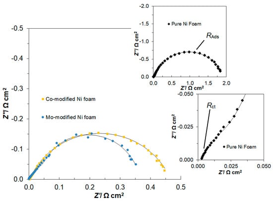 Then, the Rct parameter for the Co and Mo-modified Ni foam electrodes ranged from 0.052 to 0.022 Ω g and from 0.081 to 0.023 Ω g for the overpotential range: 270–620 mV, respectively. The former implies a considerable reduction of the Rct parameter (as compared to those Rct values recorded for the oxidized Ni foam surface); namely, by 3.6× and 2.3× at 270 mV, and by 2.1× at 620 mV for the Co and Mo-modified catalyst materials, respectively (see again Table 2 for details). Similarly, changing radius of the low-frequency semicircle (adsorption of reaction intermediates response) also resulted in a relatively constant decrease of the RAds parameter value by ca. 8× and 3× for the cobalt-based, and by 18× and 1.4× for the Mo-modified Ni foam electrodes for the overpotentials of 270 and 620 mV.