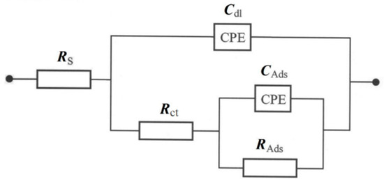 In order to further characterize the electrocatalytic properties of Ni foam-based electrodes towards the OER, the electrochemical impedance spectroscopy (EIS) technique was applied. The complex-plane EIS spectra are shown in Figure 4. It should be mentioned that all electrodes have exhibited two somewhat depressed semicircles, where the high-frequency arc could be associated with the kinetics of the oxygen evolution reaction (interfacial charge-transfer reaction step). In contrast, the intermediate/low-frequency semicircle corresponds to the surface adsorption of the reaction intermediates [29,30,31,32,33,34]. The electrochemical parameters [Faradic reaction resistance (Rct), the adsorption resistance for reaction intermediates (RAds), double-layer capacitance (Cdl) and pseudo-capacitance (CAds)] were obtained by means of two constant phase element (CPE)-modified Randles equivalent circuit model (Figure 5), and their values are presented in Table 2. The CPE element was used within the circuit in order to account for the capacitance dispersion effect, represented by distorted semicircles in the Nyquist impedance plots.