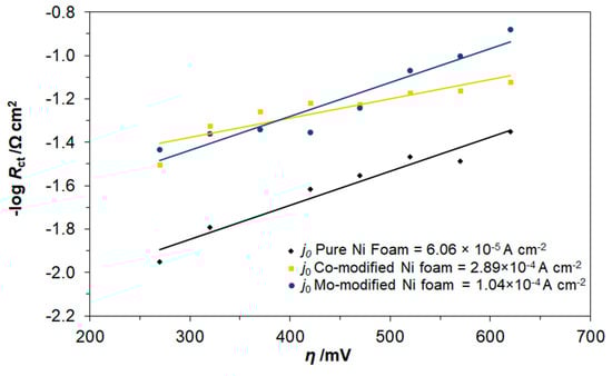 In addition, the exchange current-density values (j0) for the OER recorded for Co- and Mo-modified Ni foam samples were calculated based on the linear dependence of -log Rct vs. overpotential/ƞ, fulfilled by kinetically controlled reactions through employing the Butler-Volmer equation and the relation between the j0 and the Rct parameter for overpotential approaching 0 [43,44]. Hence, the impedance-based exchange current-density value for the studied overpotential range (ƞ = 270–620 mV with 50 mV potential increments) came to 6.06 × 10−5 A cm−2 for the as-received Ni foam sample. However, significantly higher values of the j0 parameter were recorded for both Co- and the Mo-modified Ni foam samples, i.e., 2.89 × 10−4 A cm−2 and 1.04 × 10−4 A cm−2, correspondingly (see Figure 6 below). In addition, the Rct-derived exchange-current densities are somewhat higher in comparison to those of other OER works performed on electrodes modified by Co and Mo elements in alkaline solutions [25,45]. There, the exchange current-density values recorded for Ni + Mo composite coating came to 9.7 × 10−5 A cm−2 [25] and 5.2 × 10−5 A cm−2 [45]. Similarly, values of the j0 parameter, recorded for high overpotential range on Co-based compsite electrodes came to 3.5 × 10−5 A cm−2 [46] and 1.1 × 10−5 A cm−2 [28].