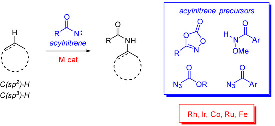 - For a recent focus on dioxazolones, see: Van Vliet, K.M.; De Bruin, B. Dioxazolones: Stable Substrates for the Catalytic Transfer of Acyl Nitrenes. ACS Catal. 2020, 10, 4751–4769. [Google Scholar] [CrossRef]