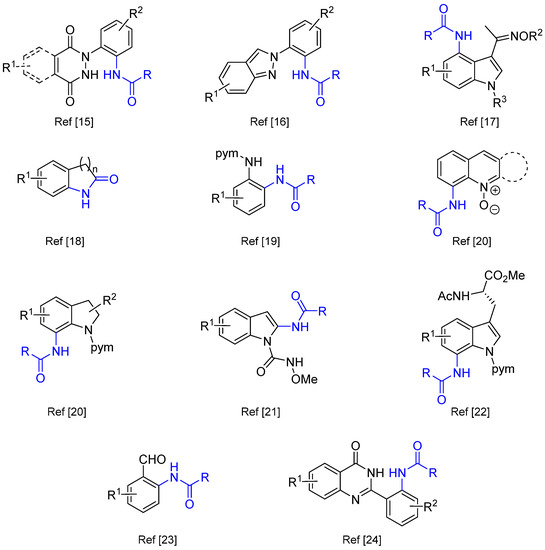- Khake, S.M.; Chatani, N. The Direct Rh(III)-Catalyzed C–H Amidation of Aniline Derivatives Using a Pyrimidine Directing Group: The Selective Solvent Controlled Synthesis of 1,2-Diaminobenzenes and Benzimidazoles. Org. Lett. 2020, 22, 3655–3660. [Google Scholar] [CrossRef] [PubMed]