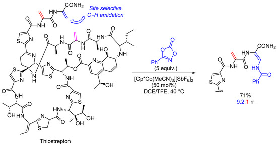 - Scamp, R.J.; deRamon, E.; Paulson, E.K.; Miller, S.J.; Ellman, J.A. Cobalt(III)-Catalyzed C−H Amidation of Dehydroalanine for the Site-Selective Structural Diversification of Thiostrepton. Angew. Chem. Int. Ed. 2020, 59, 890–895. [Google Scholar] [CrossRef] [PubMed]