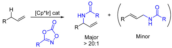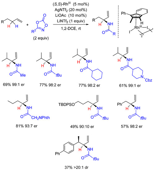 - Knecht, T.; Mondal, S.; Ye, J.; Das, M.; Glorius, F. Intermolecular, Branch-Selective, and Redox-Neutral Cp*Ir III -Catalyzed Allylic C−H Amidation. Angew. Chem. Int. Ed. 2019, 58, 7117–7121. [Google Scholar] [CrossRef] [PubMed]
