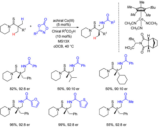 - For a racemic version of this reaction, see: Tan, P.W.; Mak, A.M.; Sullivan, M.B.; Dixon, D.J.; Seayad, J. Thioamide-Directed Cobalt(III)-Catalyzed Selective Amidation of C(sp3)-H Bonds. Angew. Chem. Int. Ed. 2017, 56, 16550–16554. [Google Scholar] [CrossRef]