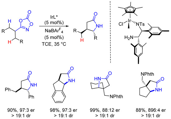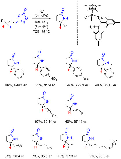 - Tan, T.D.; Ye, L.W. Chiral γ-lactam synthesis via asymmetric C–H amidation. Nat. Catal. 2019, 2, 182–183. [Google Scholar] [CrossRef]