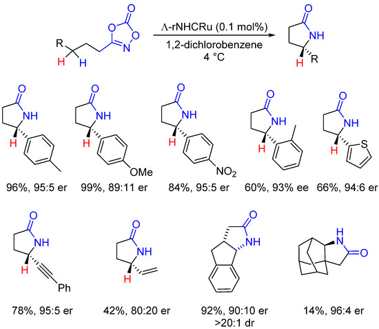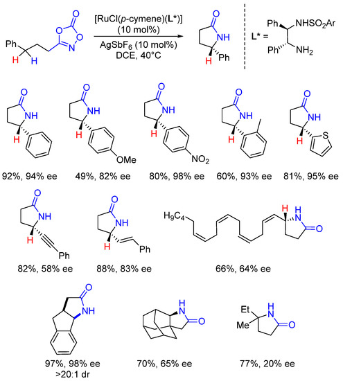 - Xing, Q.; Chan, C.M.; Yeung, Y.W.; Yu, W.Y. Ruthenium(II)-Catalyzed Enantioselective γ-Lactams Formation by Intramolecular C-H Amidation of 1,4,2-Dioxazol-5-Ones. J. Am. Chem. Soc. 2019, 141, 3849–3853. [Google Scholar] [CrossRef]