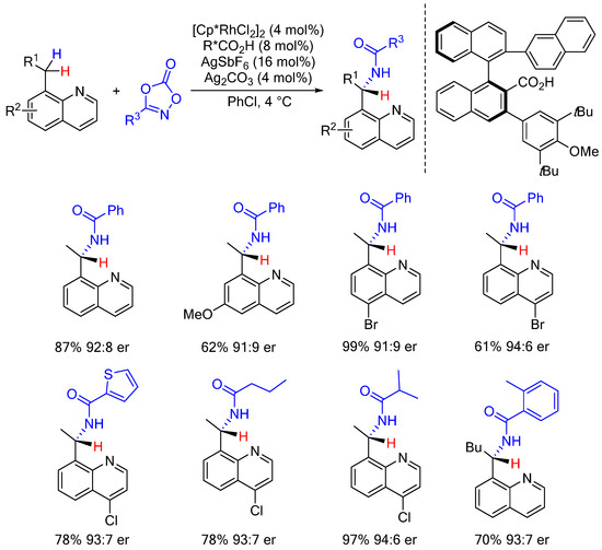 - Fukagawa, S.; Kojima, M.; Yoshino, T.; Matsunaga, S. Catalytic Enantioselective Methylene C(sp3)-H Amidation of 8-Alkylquinolines Using a Cp*RhIII/Chiral Carboxylic Acid System. Angew. Chem. Int. Ed. 2019, 58, 18154–18158. [Google Scholar] [CrossRef]