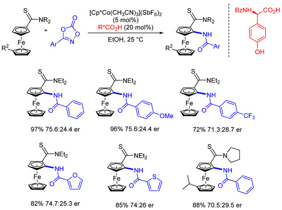 - Liu, Y.H.; Li, P.X.; Yao, Q.J.; Zhang, Z.Z.; Huang, D.Y.; Le, M.D.; Song, H.; Liu, L.; Shi, B.F. Cp*Co(III)/MPAA-Catalyzed Enantioselective Amidation of Ferrocenes Directed by Thioamides under Mild Conditions. Org. Lett. 2019, 21, 1895–1899. [Google Scholar] [CrossRef] [PubMed]