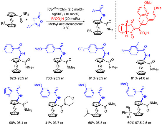 - Liu, L.; Song, H.; Liu, Y.H.; Wu, L.S.; Shi, B.F. Achiral CpxIr(III)/Chiral Carboxylic Acid Catalyzed Enantioselective C-H Amidation of Ferrocenes under Mild Conditions. ACS Catal. 2020, 10, 7117–7122. [Google Scholar] [CrossRef]