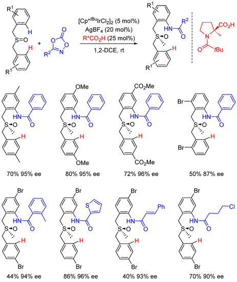 - Liu, W.; Yang, W.; Zhu, J.; Guo, Y.; Wang, N.; Ke, J.; Yu, P.; He, C. Dual-Ligand-Enabled Ir(III)-Catalyzed Enantioselective C-H Amidation for the Synthesis of Chiral Sulfoxides. ACS Catal. 2020, 10, 7207–7215. [Google Scholar] [CrossRef]