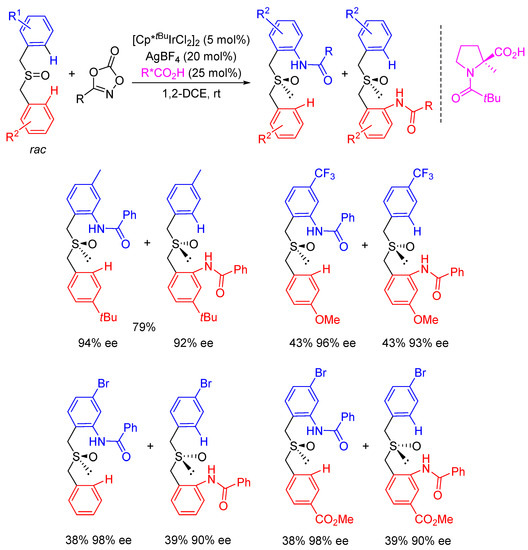- Sun, Y.; Cramer, N. Enantioselective Synthesis of Chiral-at-Sulfur 1,2-Benzothiazines by CpxRhIII-Catalyzed C−H Functionalization of Sulfoximines. Angew. Chem. Int. Ed. 2018, 57, 15539–15543. [Google Scholar] [CrossRef]