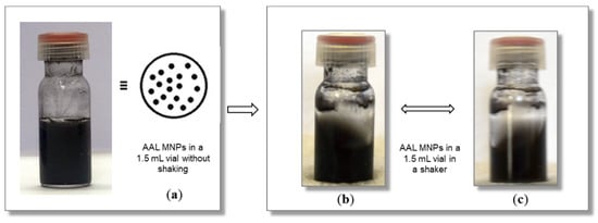 The aspartate ammonia-lyase biocatalyst immobilized on magnetic nanoparticles (AAL-MNPs) (a) as a suspension in a non-agitated vial and (b,c) in a reaction performed in a shake vial (SH). Pictures (b,c) show two opposite-position states of the reaction vial in a real orbital shaker (note the significant portion of AAL-MNPs stuck on the wall).