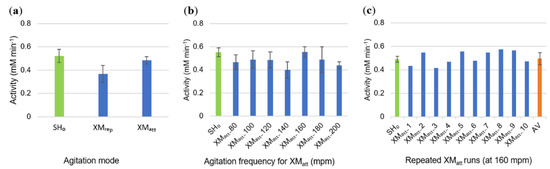 Investigation of the axial agitation mode with AAL-MNPs. (a) Dependence of the effective enzyme activity on permanent magnet configuration (XMatt: attraction configuration, XMrep: repulsion configuration; at 120 MPM) compared to shaking mode with fresh AAL-MNPs (SH0). (b) Dependence of the effective enzyme activity on the frequency of movement along the x-axis ((using the XMatt mode, in movement per minute (mpm), within the 80–200 mpm range). (c) Investigation of operational stability (repeatability) of the AAL-MNP reaction by XMrep mode at 160 mpm (the biocatalyst was used 10 times after recovery by magnetic decantation). The results and their average (AV) are compared to shaking mode with fresh AAL-MNPs (SH0).