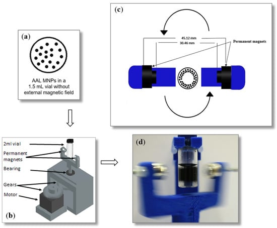 In the first device for axial agitation of the AAL-MNPs along the x-axis direction, two permanent neodymium magnets (N48, rings of 10 × 5 × 5 mm) were fixed at opposite sides of the centrally positioned sample vial (1.5 mL) containing the reaction mixture (Figure 3).