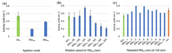 Investigation of the rotating agitation mode with AAL-MNPs. (a) Dependence of the effective enzyme activity on permanent magnet configuration (RMatt: attraction configuration, RMrep: repulsion configuration; at 150 rpm) compared to shaking mode with fresh AAL-MNPs (SH0). (b) Dependence of the effective enzyme activity on the frequency of rotation around the y-axis of the vial (using the RMatt mode, in rotation per minute (rpm), within the 80–200 rpm range). (c) Investigation of operational stability (repeatability) of the AAL-MNP reaction by RMrep mode at 120 rpm (the biocatalyst was used 10 times after recovery by magnetic decantation). The results and their average (AV) are compared to shaking mode with fresh AAL-MNPs (SH0).