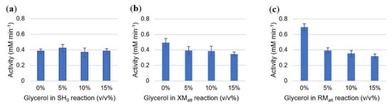 Comparison of the effective activity of AAL-MNPs in various agitation modes at different viscosities. The effective activity values of AAL-MNPs are shown in (a) the shake vial mode (SH0 at 650 rpm), in (b) the axial agitation mode (XMatt at 160 mpm), and in (c) the rotating agitation mode (RMatt at 120 rpm) at various viscosities of the reaction media (altered by adding 5%, 10%, and 15% glycerol to the reaction mixture).