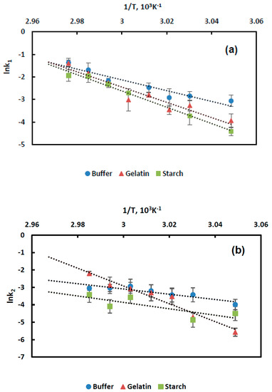 Constants of thermal inactivation rates, k1 and k2, for fast and slow inactivation were determined as the slope of the curve of BChE thermal inactivation in the absence and presence of stabilizing additives for each temperature dependence. Figure 4a,b is temperature dependence of the constants of fast and slow inactivation rates represented as Arrhenius plot. The Arrhenius activation energy of temperature inactivation in the buffer solution was 47.3 kcal/mol and 29.9 kcal/mol for the fast and slow inactivation, respectively. In the presence of the starch gel, the Arrhenius activation energy was 71.7 kcal/mol and 36.6 kcal/mol, and in the presence of the gelatin gel, it was 67.2 kcal/mol and 101.3 kcal/mol for the fast and slow inactivation, respectively. The higher activation energies of the BChE temperature inactivation in the presence of the starch and gelatin gels suggested enhancement of enzyme stability by the starch and gelatin gels.
