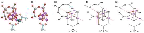 (a) 3D structure of the MnV WOC featuring the three symmetry equivalent acetate ligands (bottom, right, and front) and the tripodal [VO] ligand (left, top, and back). (b) Simplified version of the structure of the MnV WOC, in which only the full [MnO] cubane core, one acetate ligand, and a portion of the [VO] ligand are shown to avoid occlusion. To define the FF parameters, each atom is assigned an “atom type label”, such that atoms with the same label will use the same FF parameters but atoms with different labels can be assigned independent parameters. The assignment of atom types is shown in panels (c–e), where each panel shows a different subset of the entire connectivity network to avoid occlusion. The three panels are related by a 120 or 240 degree rotation of the entire molecule, before occluded atoms are removed. See the text for further discussion of the atom type labeling. The Jahn–Teller axis OJ–MC–o present in [MnMn] is highlighted as a red bold line in panels (c–e).