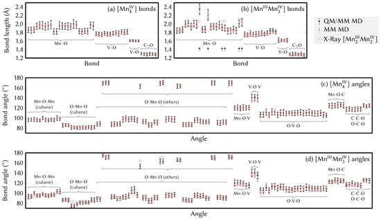 Initial force field parameters were obtained by combining pre-existing force fields of polyoxovanadate cages [], high-valent manganese dimers [], and ab initio calculations. This force field was refined by tuning the equilibrium values and the force constants of the bond and angle potentials, using the distributions of bonds and angles obtained from reference QM/MM MD trajectories. It was observed that the refined force field parameters properly describe the axial Jahn–Teller distortion characteristic of a d Mn center in an octahedral ligand field. Furthermore, we found that along the dynamics, according to the Mulliken spin populations and the bond lengths of the bonds involved in that geometrical distortion, no valence change or electron transfer occurred—hinting at valence localization in this complex. In general, good agreement of bond lengths and angles between the MM MD, QM/MM MD, and (with exceptions) the X-ray structure [] was found.