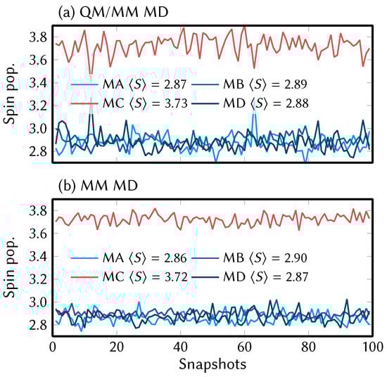Mulliken spin populations of all Mn atoms in [MnMn] along the QM/MM MD trajectory (a) and the MD trajectory (b). Here, MC is the Mn atom. The spin populations were computed at the same level of theory as the reference QM/MM MD trajectories.