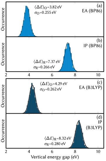 where indicates an average over all geometries sampled from the trajectory of the reduced state, and is the analogue for the oxidized state. This expression can be further simplified by applying Marcus theory [,,], in which it is assumed that the solvent responds linearly to a change in the solute. As a consequence, the distributions of the vertical energy gaps for both the reduced and the oxidized species—that is, the distributions of the IEs and the EAs, respectively—will be Gaussian functions, and their standard deviations will be the same. Hence, the Helmholtz free energy difference expression (Equation (10)) can be simplified as follows: