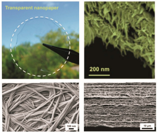 Traditional paper, with cellulose fibers of about 20 µm in diameter, is usually rough (roughness of hundreds of micrometers) [1]. However, cellulose can reach the nanometer size by means of a disintegration process of the micrometer-sized cellulose fibers. Some examples are microfibrillated cellulose (MFC), nanofibrillated cellulose (NFC), and nanocrystalline cellulose (NCC), which are produced with different disintegration processes [1,6,7]. The transparent NCC membrane (Figure 1) is composed of well-organized three-dimensional structures, with long entangled filaments of a cellulose microfibril network. The average width of the cellulose fibers is within 20–50 nm [7]. Another type of nanocellulose is bacterial nanocellulose (BNC). The bacterium Gluconacetobacter is normally responsible for the production of BNC membranes (Figure 1), and such a nanomaterial presents enhanced chemical purity, high crystallinity, and low surface roughness and porosity [8]. As expected, the purified cellulose materials have improved intrinsic properties, including a higher Young’s modulus and lower thermal expansion coefficient, among others [1]. The purified BNC membranes are also transparent, which allows their integration in several applications that require this specification.