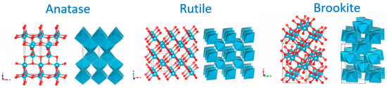 Titanium dioxide has been largely investigated as a photocatalyst due to its strong oxidizing abilities for the decomposition of organic pollutants, and also its chemical and physical stabilities, nontoxicity, low cost, superhydrophilicity, and earth abundance [13,69,71,81]. TiO2 occurs in nature, presenting three crystalline phases: two tetragonal phases, i.e., anatase and rutile, and an orthorhombic phase, i.e., brookite (Figure 3) [119]. However, it also occurs in an amorphous form. Anatase and brookite are both metastable phases that, when heated, transform into rutile, the most stable phase [120,121]. The lattice parameters of anatase (I41/amd) are a = 0.3785 nm and c = 0.9515 nm, for rutile (P42/mnm) are a = 0.4594 nm and c = 0.2958 nm, while brookite (Pbca) has lattice parameters of a = 0.9184 nm, b = 0.5447 nm, and c = 0.5145 nm [122,123]. The three crystalline phases have TiO6 octahedra with different distortions, in which the structural and electronic properties of all the phases can be determined by the Ti–O bonds. The description of the TiO2 structure and stoichiometry is well documented elsewhere [13,71,122,124], so this will not be covered here.