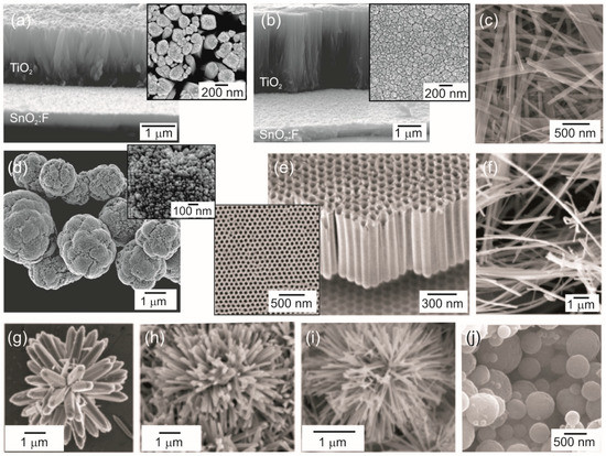 SEM images of several TiO2 nanostructures. (a,b) TiO2 nanorods grown of a SnO2:F seed layers [38], (c) TiO2 nanobelts [174], (d) TiO2 nanorods aggregated to form micro-sized spheres [37], (e) TiO2 nanotubes formed by anodization [175], (f) TiO2 nanowires [176], (g–i) different types of TiO2 nanoflowers [155], and (j) TiO2 nanospheres [156]. Reproduced with permission of Elsevier [38,156,174,175,176], MDPI [37] and Springer Nature [155].