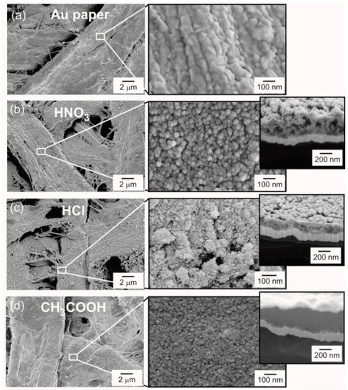 SEM images of the Whatman paper with an Au film and the TiO2 nanostructured films grown under microwave irradiation to be used as EC devices. Magnified SEM image of the Au film in (a) and magnified and cross-section SEM images of the TiO2 nanostructured films produced with (b) nitric acid; (c) hydrochloric acid; and (d) acetic acid [15]. Reproduced with permission of MDPI [15].