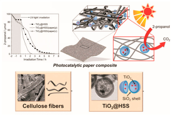 Sboui et al. [183] reported the functionalization of papers with TiO2 decorated with AgBr nanoparticles. Their photocatalytic performance was evaluated through the degradation of 2-propanol in gas phase under sunlight exposure. In another approach, the fabrication of photocatalytic paper using TiO2 nanoparticles confined in hollow silica capsules has been shown (Figure 6) [55]. The encapsulation demonstrated a shielding effect that can insulate the TiO2 nanoparticles from the surrounding environment and prevent the self-degradation of organic support materials under UV light. The encapsulated TiO2 nanoparticles have been deposited onto the cellulose paper either by a chemical adhesion process via ionic bonding or by a physical adhesion process using a dual polymer system. The photocatalytic activity was assessed with 2-propanol degradation under UV-light exposure.