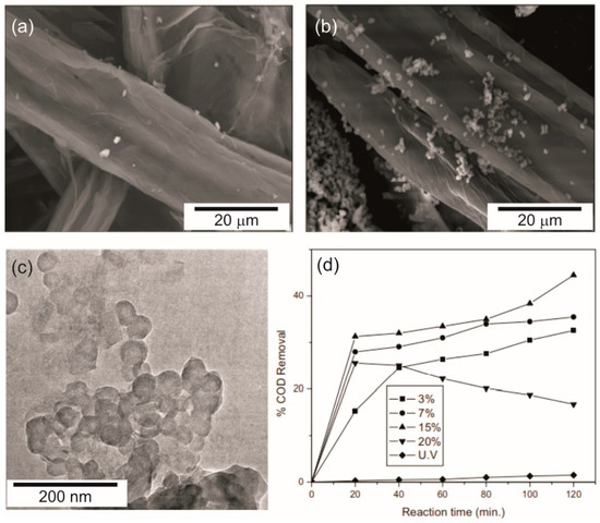Photocatalytic papers based on a TiO2/Sodium alginate nanocomposite were reported in [185] (Figure 7a–c). Their photocatalytic activity was investigated with the removal of chemical oxygen demand of wastewater. The increase in the photocatalyst increased the wastewater mineralization and enhanced the removal of chemical oxygen demand, as expected (Figure 7d). It has been shown that the presence of sodium alginate as a biopolymer increased the adhesion of nanoparticles to paper fibers and reduced the harmful effect imposed by the photocatalyst.