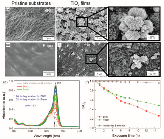 When it comes to growing TiO2 nanostructured films on paper, where paper is the substrate, D. Nunes et al. [19] reported the synthesis of TiO2 nanostructured films using microwave irradiation at low temperature synthesis (80 °C) and without any seed layer, in which bacterial nanocellulose and tracing paper were tested as substrates (Figure 8a–d). Their photocatalytic activity was investigated using Rhodamine B degradation under solar radiation. The nanocellulose based material demonstrated higher photocatalytic activity than tracing paper, in which the structural differences of the TiO2 nanostructured films and substrates play a key role on the behavior observed (Figure 8e,f). It has been reported that a nanocellulose substrate with a 3D structure at the nanoscale can effectively enhance photocatalytic activity. Moreover, the 3D closed packed cellulose nanofiber network of nanocellulose fully covered with TiO2 provides more active sites for the photoreaction, and also facilitates the species’ transport and electrons’ collection [191]. The BNC-based material could be reutilized despite activity deterioration over the exposures.