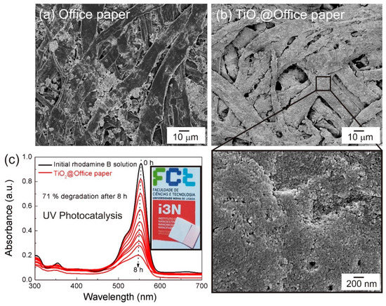 Office paper was also used as substrates for growing TiO2 nanostructured films. Figure 9 showed the scanning electron microscopy (SEM) images of the pristine office paper (Figure 9a) and the TiO2 nanostructured films grown under microwave irradiation on the office paper substrate (Figure 9b). It can be observed that microwave synthesis totally covered the paper substrate, and a continuous nanostructured TiO2 film could be achieved. These films were investigated as photocatalysts, and their photocatalytic activity was assessed for Rhodamine B degradation under UV radiation (Figure 9c). The gradual rhodamine B degradation was observed. The photocatalysts were resistant to water immersion, and after the photocatalytic experiments, the papers could be recovered and dried for further tests. The direct growth of TiO2 on paper with chemical-based processes reduces the production costs of the photocatalysts due to the lack of parallel processes, such as seed layers, or annealing. An analogous study reported the photocatalytic degradation of Rhodamine B using office paper as a substrate under UV and solar radiation [12]. This study demonstrated the synthesis of TiO2 and ZnO nanostructures using hydrothermal synthesis assisted by microwave irradiation, using office, Whatman, and commercial hospital papers as substrates. Their photocatalytic activity was assessed, and higher Rhodamine B degradation was reported for photocatalysts grown on Whatman paper [12]. T. Freire et al. [192] reported the growth of TiO2 thin films composed by very fine particles of ~11 nm on Whatman paper using hydrothermal synthesis assisted by microwave irradiation. These films had their photocatalytic activity tested with the photodegradation of Rhodamine B under solar radiation, and the effective contribution of paper on the final photocatalytic performance has been estimated.