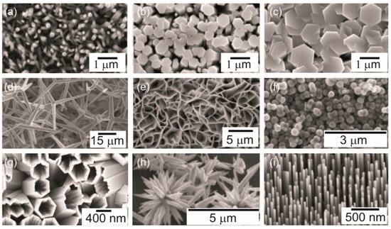 SEM images of several ZnO nanostructures. (a) ZnO nanorods [204], (b,c) ZnO nanoplates [204], (d) ZnO tetrapods [222], (e) ZnO nanosheets [205], (f) ZnO nanospheres [206], (g) ZnO nanotubes [207], (h) ZnO nanoflowers [209], and (i) aligned ZnO nanowire arrays [208]. Reprinted with permission from direct growth of freestanding ZnO tetrapod networks for multifunctional applications in photocatalysis, UV photodetection, and gas sensing, ACS Appl. Mater. Interfaces 2015, 7, 26, 14303–14316, copyright 2021 American Chemical Society [222], and Elsevier [204,205,206,207,208,209].