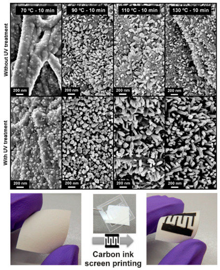 The growth of ZnO on paper substrates has also been reported previously. Araujo et al. [223] produced 3D SERS platforms based on ZnO nanorod arrays grown on paper substrates using a fast and low-temperature hydrothermal method assisted by microwave radiation. Pimentel et al. [11] produced paper-based UV sensors based on ZnO nanorods, also grown using a fast and low-temperature hydrothermal method assisted by microwave radiation. Two types of paper substrates were tested, i.e., tracing and Whatman papers. The effect of the synthesis temperature on ZnO nanostructures was investigated and an UV/Ozone treatment performed directly to the ZnO seed layer prior to microwave assisted synthesis revealed expressive differences regarding the formation of the ZnO nanostructures (Figure 12). Manekkathodi et al. [224] reported the production of prototype photoconducting devices and PN junction diodes were fabricated with aligned single-crystal ZnO nanowires and nanoneedles on paper using low temperature and a non-hazardous chemical solution.