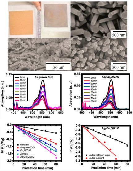 Baruah et al. [20] demonstrated that ZnO nanorods grown on paper supports prepared from soft wood pulp are promising photocatalysts. The produced paper embedded with ZnO nanorods in its porous matrix revealed enhanced photocatalytic degradation of methylene blue and methyl orange under visible light, being reused several times. Tsai et al. [54] reported a photocatalytic paper comprised of Cu2O and Ag nanoparticles decorating ZnO nanorods produced using a hydrothermal method, and its application in the visible light photodegradation of Rhodamine B. The photocatalytic activity of pure ZnO-based paper and paper containing Cu2O and Ag separately or together have been tested, in which the paper with Cu2O and Ag nanoparticles co-decorating the ZnO nanorods demonstrated the best photocatalytic efficiency (Figure 13).