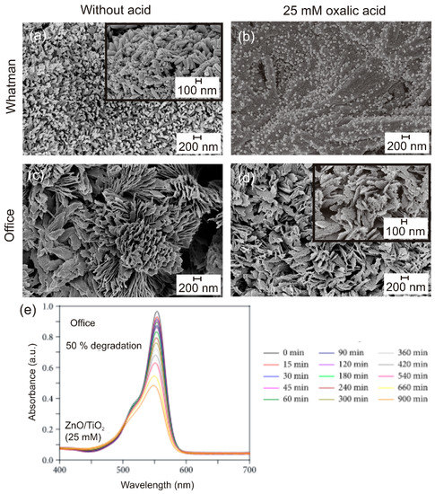 ZnO/TiO2 heterostructures grown on Whatman and Office papers having TiO2 synthesized without acid and with 25 mM of oxalic acid (a–d). The inset in (a) magnifies the heterostructure, while the inset in (d) evidences the surface modification with oxalic acid. (e) Rhodamine B photodegradation under UV light of the heterojunction grown on office paper and represented in (d) [12]. Reproduced with permission of Hindawi [12].