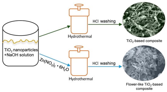 Herein, we developed a facile alkaline hydrothermal procedure to prepare flower-like TiO2-based composite for adsorption–photocatalytic degradation, and the proposed synthesis mechanism is shown in Figure 1. NaOH was a morphology-directing agent and reactive etchant. The flower-like ZnO was synthesized and used as a sacrificial template. The proper NaOH concentration contributed to form a flower-like ZnO template and further formed the sodium titanate, which was produced by the reaction of TiO2 and NaOH. Sodium titanate self-assembled onto the ZnO template to form flower-like morphology. After hydrochloric acid (HCl) treatment, the ZnO template was completely removed, and sodium titanate was converted into TiO2-based composite. Furthermore, the formation mechanism of TiO2-based composite with different morphologies obtained under different NaOH concentrations was studied and proposed. Moreover, the adsorption and photocatalytic performances of the flower-like TiO2-based composite obtained toward MB solution were investigated and compared with those of TiO2 nanoparticles.
