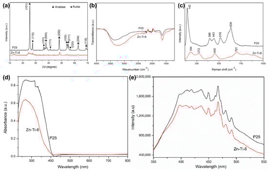 Optical properties: (a) XRD, (b) FTIR, (c) Raman, (d) UV-Vis diffuse reflectance spectra, and (e) photoluminescence spectra of P25 and Zn-Ti-6.