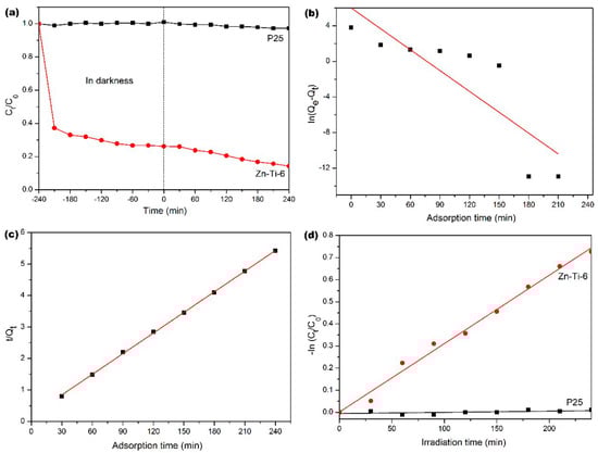 (a) Adsorption and photocatalytic degradation of MB solution (60 mg/L, 50 mL) by P25 and Zn-Ti-6. Adsorption kinetic models in the linear transformation for Zn-Ti-6: (b) pseudo-first-order and (c) pseudo-second-order. (d) First-order kinetic fitting for P25 and Zn-Ti-6 photocatalytic degradation of MB solution.