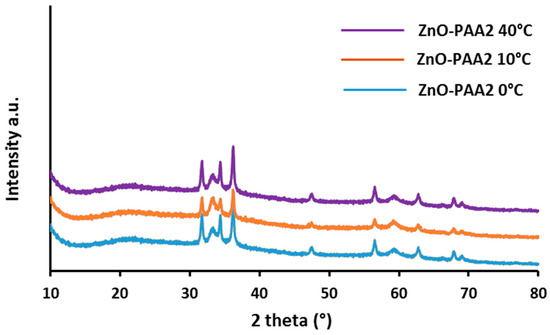 The XRD results associated with ZnO/PAA2 synthesized at 0 °C, 10 °C and 40 °C showed no difference in crystallinity and crystallite size (Figure 2, Table 3). However BET specific surface area measurements exhibited differences between materials (Table 3), with the highest surfaces (90 m2·g−1) being obtained at low temperature (0–10 °C). The TG analyses did not show any effect of the synthesis temperature on the inorganic/organic ratios since they were identical (Figure S5, Table 3).