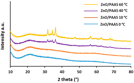 XRD diffraction patterns of ZnO/PAA5 at different synthesis temperatures.
